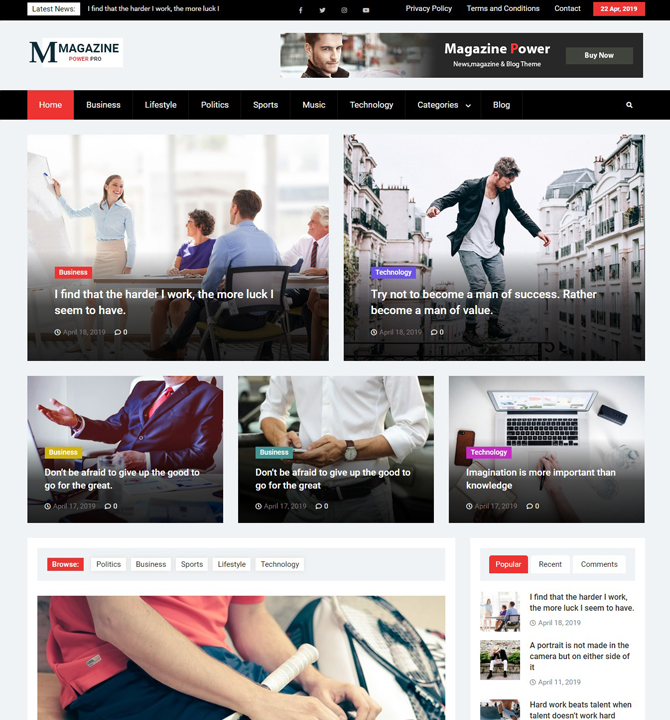 Magazine Power Pro is a clean, responsive and purposeful WordPress theme with a creative outlook focused for news portal and magazine sites. It provides plenty of unique features to make it a solid choice for your website, especially if your focus is on magazine or news. Theme helps you to display your content in a way that’s organized, attractive, and elegant. To give you head-start, it provides sample demo content with one click import feature. With this you can have quick overview what theme offers. The theme is responsive and cross browser which will make your site attractive and eye catching in any browser and different variations of devices screen size.